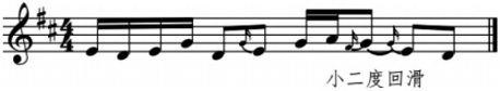 所谓小三度、大二度和小二度回滑,是指滑音上行阶段可以采用不同的起始音,分别拉出小三度、大二度、小二度的效果。音程关系上的细微差别,能够使回滑音在质地、色彩、韵味上产生差异,形成千变万化的腔韵效果,令人百听不厌。在实践运用中,需根据唱词语义,结合音乐发展的逻辑,有选择性地使用。