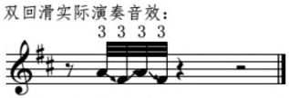 双回滑音,是指同一手指从起音开始连续完成两次回滑的过程,从而产生比单次回滑更加延绵婉转的音响效果。双回滑音一般运用在速度较慢、情绪较为内敛的唱腔中,能够产生婉转缠绵的艺术效果。