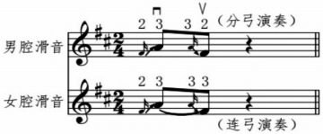 以最具代表性的小三度滑音为例。男腔滑音全过程运用异指垫指滑音的方式,以二指垫指上滑到三指,再由三指垫指下滑到二指,从而完成整个滑音过程。右手运弓多运用分弓,并辅以音头。滑音效果因为左手换指与右手音头的配合,显得铿锵有力、顿挫分明。
