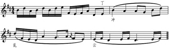 再如演奏冲乱云的“乱”字(见谱例2),扬剧主胡几乎从来不单拉D和#F两个音,而是以三指滑音在两音中间加上独特润饰。演奏方法为三指从高音D音滑动大二度到E音,然后弓子换内弦,三指再从A音滑到#F音。这也是运用三指滑音来突出扬剧独特韵味的典型范例。