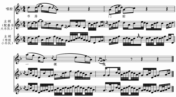 2.同一唱段在不同配器方式、表演场合中,运用不同润饰手法进行演奏。当配器形式为人数较多的大型乐队时,主胡伴奏受到来自作曲家和指挥家的制约,灵活发挥的余地较小,演奏相对保守,对比唱腔谱作出的变化也相对较少。主胡需综合考虑乐队配器的浓淡等因素,仅在乐队配器较淡处作适当凸显,而不能任意地自我表现。当以传统四大件(主胡、副胡、琵琶、扬琴)形式进行伴奏时,主胡则当仁不让地掌握起引领乐队的主动权。此时主胡受到来自乐队的制约相对较少,可以进行较为自由的发挥,在旋律进行中,音符密度大为增加,节奏变化也更加灵活。