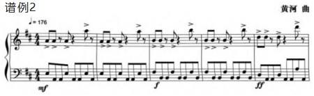 扬琴的音位在琴面上是处于分散开的,音与音之间的距离以四五公分均匀密集排列开来。对于演奏者来说演奏动作是上下左右全方位的运动,相较于其他种类的乐器演奏,扬琴最难之处在于把控准确的音位,它要求演奏者具备极高的空间感知能力和手眼协调能力。演奏者需要在短时间内准确判断每个音位的位置,并且要通过双臂的灵活运动,确保琴竹能够精准地击打在目标音位上。这对于演奏者来讲,是在技巧上面临的最大考验之一。尤其是在处理速度飞快、跳跃幅度大的乐段时,单纯依靠视觉来定位音位,是无法保证达到几乎完美的落音准确性的。因此双臂肩与肘关节的运动控制,在前后左右音位演奏变化中起到至关重要的作用。演奏距离较近的音符之间的音位变化时,双臂的肘关节周围肌肉群要体会有控制力的细微移动变化,及练习肌肉群在细微动作变化时对音位把控的精准度。演奏距离较远的音符之间的音位变化时,双臂的肩部关节周围肌肉群则需要放开锻炼和记忆跳度大的音位之间的距离感,做到准确的肌肉记忆。一旦遇到速度快、跳度大的乐句时,用眼睛盯准音位演奏是远远达不到落音十拿九稳的准确度,而双臂在前后左右演奏音位变化中却起到至关重要的作用。因此,需要演奏者对扬琴音位布局的深刻理解和记忆同时,进行双臂精确的控制力的训练,只有这样,才能在演奏过程中做到心手合一,让每一个音符都准确无误地呈现理想的音色。例如谱例2黄河高阶练习曲《大跳练习》中右臂充分练习低音区五度音之间的来回移动,左臂的肩、肘关节充分锻炼高音区八度音之间远距离音位的移动记忆。