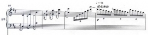 再如谱例3《秋》(黄河作曲)中快板高音区,双手十六分音符交替上下快速反复移动时,肩、肘部运动要记忆的是反复同样动作时的连贯记忆。
