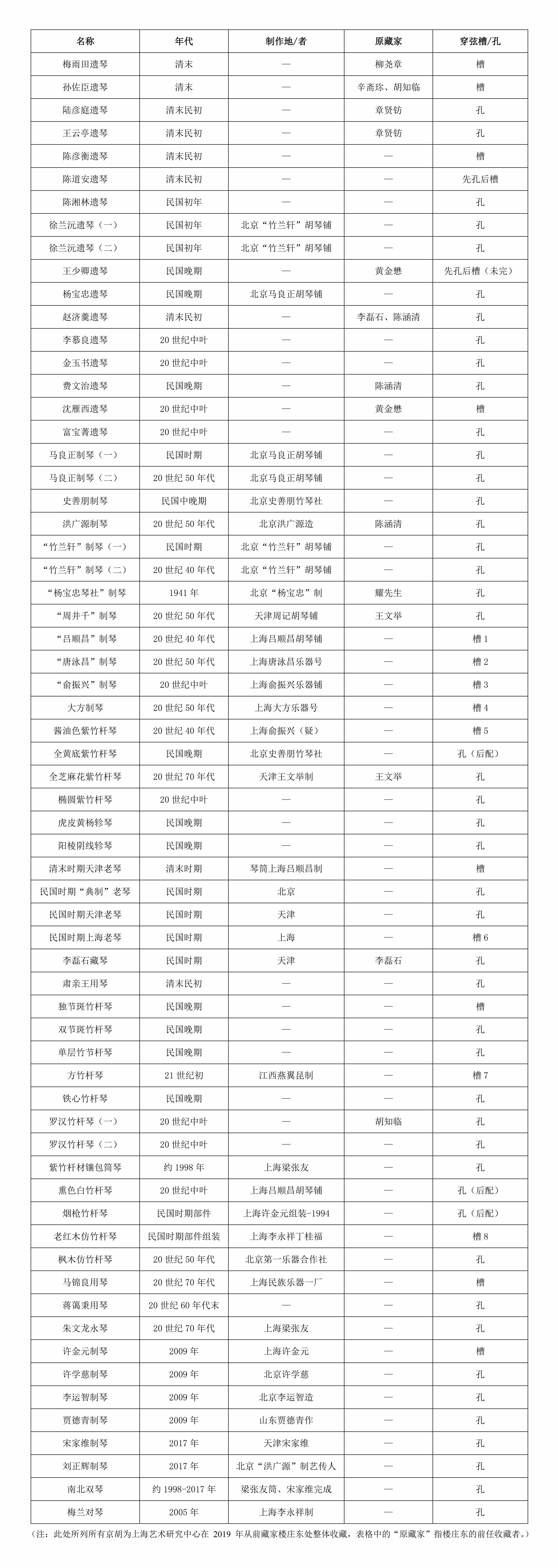 过去,京胡弦轴系弦孔的制作基本按地域习惯,偶有特例。笔者查阅上海艺术研究中心收藏的66件京胡藏品资料。其中,弦轴采用系弦孔的案例有48件,含24件北方制琴、4件南方制琴,另外20件制作信息不详;采用系弦槽的案例有16件,含10件南方制琴、1件天津琴杆上海琴筒的装配琴,另外5件不详。(见表2)