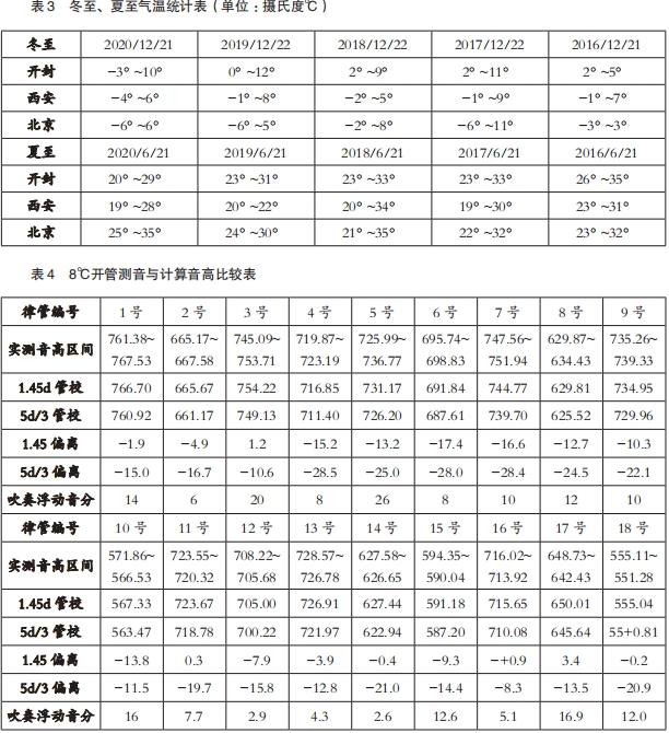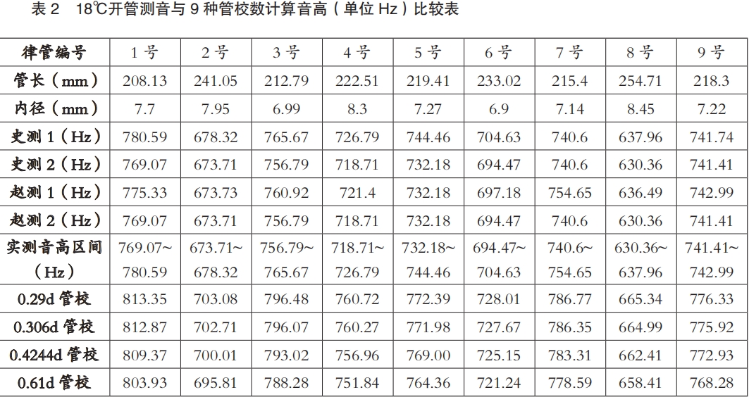 (k为管口校正数)计算音高。将计算音高与律管实测音高比较后,找出最符合实测的管口校正数。此外,将环境温度代入赵松庭的管内温度公式①,可推算管内温度,再代入公式③和④,得到的音高就可以用于检验公式①
