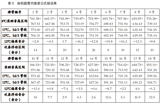 赵松庭先生曾提出过管内温度的公式:管内的实际温度=1/3(36℃-大气温度)+大气温度,算出8℃时,管内温度为17℃,声速约为341609mm/s,代入5d/3管校数的计算值已经全部超出实际吹奏的音高浮动区间(见表5),这说明代入的声音速度过高,管内温度并没有达到17度。于是,笔者按照附录中的计算声速,在EXCEL中从8℃开始逐一替换公式中的速度,当代入12℃的声速338653mm/s后,这一偏离值与实测“吹奏音高浮动区间”已经极为贴近(见表5“12℃,5d/3管校”一栏)。看来,律管上,管内温度的变化幅度没有笛箫上大。