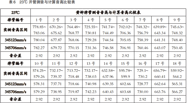 1.按照t0=(6t+33)/7计算出23℃环境下,管内温度为24℃,将管内声速345706mm/s代入公式④,算得每升高1℃,音高升高2.9音分。同时,计算值与测音音高区间基本符合(表6)。