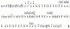 3”定弦。如同前述,在整首唱段中,月琴主要以外弦弹奏,外弦的空弦音为“3”,第十二品音位为高八度的“