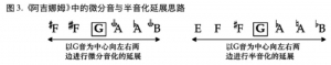 在作品中,作曲家通过对半音化材料、音阶进行分组并将其交替呈现来实现对基本音高素材的运用。首先,半音化的音高材料是作品在音高建构体系上的主要语汇之一,其体现出对藏戏念诵韵白的模仿。藏戏的念诵韵白分为“雄”即说戏,“夏”即辩韵(或对韵) ,和“觉谢”即快韵三种形式,主要由能够头尾相连的一个精炼的核心短句构成。通过从低到高的滑音式向上吟声,到达念诵者认为合适的音高后,在比较狭窄的音区内略带变化地循环重复其核心短句从而形成类似“无终卡农”的特殊旋律句法[7]。在作品中,作曲家通过采用围绕中心音的微分音延展与半音延展思路进而在狭窄的音区内实现了对藏戏念诵韵白的模仿(见图3) 。微分音化的音高运动模式出现于作品第一部分 A 段落的中胡声部,其呈现出微分音运动 + 长音落音的基本材料构成模式。片段中的长音均落在 G 音上,突出了以 G 音为中心的音高建构模式。