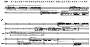 谱例 1 显示了第一部分 B 段落的局部半音音组运用。从中可见,音组3-②在该片段中具有较高的出现频率; 段落整体上呈现出音组的线性化发展模式。随着音组3-③、4-②及4-④的引入,半音化音高开始由G音逐渐往上延展到bA 音、A 音及bB音,展现出半音运动的微小音程间距所带来的张力与线性推动力。