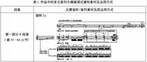 第二,作品对模糊调式音阶或音列的使用也呈现出分组与交替运用的特征。模糊调式音阶属作曲家设计的人工音阶范畴,其呈现出无固定中心音且调式内各音级可自由游移的特征。例如,音阶bB-C-D-E-#F-G-A-bB便是作品中的模糊调式音阶之一,其在第一、二部分中呈现出分组化、交替化使用的特征。该音阶素材在第一部分 B 段落的中后位置出现,其可分为①bB-C-D-E与②#F-G-A-bB两个音组(见表1中谱例2a) 。音组①为全音阶结构,其分别被用于该段落中低音笙与低音唢呐的旋律与二胡 I 的三十二分音符快速音型; 音组②以首尾两音之间的减四度音程为特征,可见于段落中的琵琶、二胡 II 等声部。该音阶还以四音组的方式被用于作品第二部分的C1段落(见谱例2b) ,包括①C-D-E-#F、②F-G-A-B、③bB-C-D-E及④E-#F-G-A。前三个音组均为全音阶结构,且在旋律中具有较多的出现频次; 音组E-#F-G-A在C 1段落的前三个乐句中仅出现一次,其位于第二乐句的开头,具有音响色彩的对比、调节与转折作用。