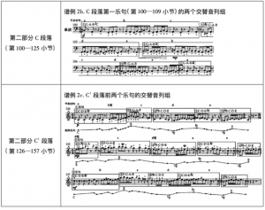 除去以上所讨论的b B 音上的人工模糊调式音阶外,作品第二部分的 C 段落也采用了典型的分组与交替化音高建构模式。该段落将五音列#F-G-A-B-#C分裂为音组①G-A-B-#C与音组②#F-G-A-B,并将两个四音组进行交替化呈现(见谱例 2c) ,使段落的旋律呈现出逻辑化、规律化的建构方式。