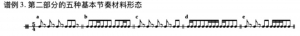 轮转的材料延展方式主要体现在作品第二部分对节奏材料运用上。作曲家通过设计 a、b、c、d、e 五种以小节为单位的不同节奏材料及其轮转矩阵(见谱例3和表2) 进而展现出对节奏材料的特色化运用模式。