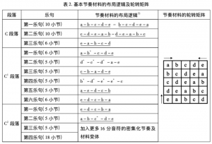 表 2 罗列了第二部分各段落中乐句的节奏材料组合模式。对应右图中的节奏材料轮转矩阵与谱例 2b、谱例 2c 中的部分旋律片段,我们可以看到作曲家在进行节奏材料组合时的思路与逻辑。C 段落的三个乐句分别将矩阵每一横行的节奏组合模式依次呈现。谱例 2b 显示了 C 段落第一乐句的材料节奏材料组合模式,其由a-b-c-d-e与b-c-d-e-a两个轮转组合而成,分别对应轮转矩阵的第一、二行。C 1 段落的第一乐句保持了a-b-c-d-e的组合模式,第二乐句打破了五个材料依次轮转的模式,并通过对节奏材料的重复及变形而获得了更多的变化; 第三、五、六乐句则引入了矩阵中第四、二、一行组合模式的逆行形式。C 2 段落的前两个乐句延续了矩阵中的节奏材料,而第三、四乐句则加入了更多的十六分音符节奏及节奏材料变体,营造出更为密集、流动且富于推动力的节奏设计及走向。