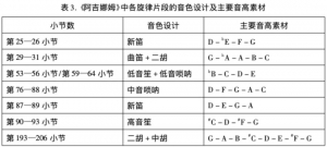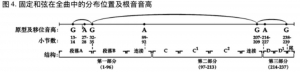 图 4 展示了该和弦在全曲中的分布位置及其移位或变形的根音音高。从中可见,该和弦主要分布于作品的首尾两个部分。其中,建立在 G 音上的原型形态在全曲中占有主要地位,分别与建立在 A、b A 音上的移位形式形成交替,照应了整部作品的交替化材料布局模式。