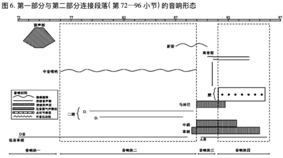 横向并置的音响形态展现出音响织体的瞬息变换与多元并置,其主要出现于作品第一、二部分,以及第二、三部分之间的连接段落中。以第一部分与第二部分之间的连接段落为例。该段落在横向上呈现出四个不同音响块的并置(见图 6) 。音响块一(第72—75小节) 以笛声部类似六边形的几何式音响造型为特征; 音响块二(第76—88小节) 呈现出旋律线条(中音唢呐及新笛声部) + 长音背景(二胡与低音革胡等声部的持续长音D) 的音响形态; 音响块三(第89—90小节)由高音笙声部的半音化旋律与低音弦乐与马林巴声部的长音和弦构成; 音响块四(第91—95小节)则以小鼓和大鼓声部的点状敲击节奏为特征。各音响块之间形成了横向上的对比、连接与并置,使音乐在音响的移步换景中获得了结构的推动力。