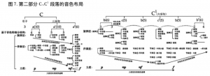 音响的对比模式展现出不同音响块、音响形态之间的对比与对话式音色布局。以第二部分的 C 1 段落为例。从图 7 可见,该段落旋律层的音色配置并未呈现出明显的线性变化趋势,而是在3—8 个声部的乐器数量中实现了音色的对比与变化。例如,就段落的第一、二乐句而言,第一乐句的旋律①(主要旋律) 采用了曲笛、中音笙与中胡的音色配置,而第二乐句的旋律①则采用梆笛、中音笙、琵琶、中阮与马林巴的音色配置。除了中音笙音色外,其余声部均采用新的音色来呈现该旋律; 第一乐句的旋律②(次要旋律) 为琵琶与中阮的音色配置,而第二乐句的旋律②则采用了梆笛与中阮的音色配置。该段落随后的各乐句也都呈现出音色配置上的对比化特征。此外,该段落在音高材料的设计上呈现出b-c-b-c1-b-b1的交替、回旋与对比形态,结合依乐句结构而变换的音色配置展现出基于音高、音色等多重因素的对比化音乐思维。