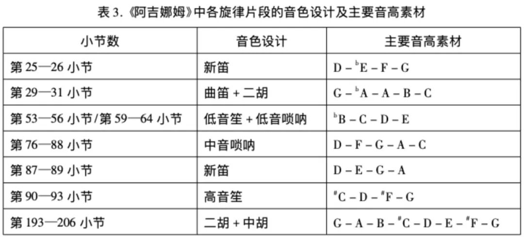 作品《阿吉娜姆》的三个部分呈现出以音响—旋律—音响为主体的音响织体布局模式。在首尾两个部分中,作曲家一方面充分发掘了民族管弦乐队的音响张力,并以独特的音响形态建构起鲜明而富有特色的音乐形象; 另一方面,这两个部分也出现了局部的旋律片段。这些旋律片段以独奏或几种乐器的复合音色呈现,在突出民族管弦乐器自身特征与属性的同时也展现出音色背后特定的文化寓意与地域符号。在表3中,笔者总结了作品中的主要旋律片段及其音色设计。