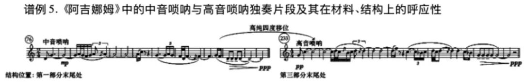 作品中的这两处唢呐独奏展现出旋律素材在音高、结构上的呼应性。音高上,两处唢呐声部的旋律均以纯四度音程开始,具有跌宕起伏的特征; 且第 233 小节的高音唢呐声部可以看作是第76 小节中音唢呐声部的高纯四度移位。结构上,两处唢呐独奏均展现出相应的结构意义。第 76小节的中音唢呐音色位于第一部分末尾并作为第一部分收束时的特征性音色; 第 233 小节的高音唢呐声部位于第三部分末尾,其在结构上与中音唢呐音色形成了呼应。音响上,中音唢呐旋律仅以二胡与低音革胡声部的持续长音 D 为背景,展示出空旷的独奏音色效果; 高音唢呐声部则建立在笛类声部的无音高气声奏法、吹管类声部的纸张音效、弹拨类声部的循环化半音音型以及二胡声部的人声合唱等音响的混响融合基础上。其背景音响较先前的中音唢呐旋律而言更为复杂与多元。尽管如此,高音唢呐的明亮音色在该段落中仍然是非常突出而富有效果的。