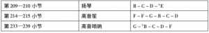 该固定和弦因出现位置的不同而具有不同的结构功能与意义。具体而言,这些和弦大多位于某一结构的起始、终止或过渡与连接等结构位置,并以稳定化的长音音响形态形成了对结构节点的支撑。以下,笔者将对不同结构位置的固定和弦运用进行讨论。第一,起始点。第 32 小节的 G 固定和弦与第 214 小节的 A 固定和弦均位于某一结构的起始处。前者位于第一部分 B 段落的起始处,其在马林巴、唢呐和笙声部中渐次呈现,并逐渐引入了该段落中的半音化音高材料;后者位于第三部分的起始,也以笙与唢呐声部的稳定化音响预示了第三部分的开篇。第二,终止点。第 89 小节的 A 固定和弦(马林巴声部) 及第 238 小节的 G 固定和弦(笙、唢呐各声部、马林巴及拉弦乐组) 均位于第一、三部分的终止处,形成了段落的有效收束。第三,过渡与连接。固定和弦还被用于结构与结构、乐句与乐句之间的连接处,形成对音乐段落、材料的衔接。第 27 小节的b A 固定和弦位于由新笛演奏的独奏旋律与二胡 + 曲笛演奏的复合音色旋律之间,形成两个旋律线条之间的衔接结构; 第207小节的G 固定和弦以中音笙与低音笙的音色呈现,并位于由拉弦乐组的旋律线与扬琴独奏的旋律线之间,形成了二者间的过渡与连接。
