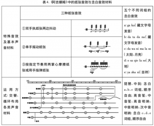 对宗教化音响氛围的塑造主要体现在作品的第三部分中。该部分通过综合笛类乐器的无音高气声奏法、笙与唢呐声部的纸张与念白音效、弹拨乐组的半音化音型以及低音乐器的持续音声部等四种音响类型进而模仿并再现了藏族诵经音乐的仪式化与宗教化氛围。在作品中,这四种音响以并不清晰、分明的界限形成了混响融合的音响效果。其中,笙与唢呐声部的纸张音效与念白音效是第三部分才出现的全新且富有特色的无音高音效,其以交替化布局为特征,延续了作品在音响材料布局上的基本思路。