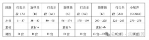 《欢乐的夜晚》既是巧妙地融合了民间吹打音乐中以“吹奏”、“打击乐”两类音色循环往复之特点,作品以D宫调贯穿全曲,模拟性的打击乐段落与旋律段有序地穿插更迭,联缀成了这种“缠达式”的音色循环结构(见表格1):