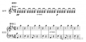 两个主题素材采用中国民间音乐某些常见的旋律发展手法,但不似中国传统器乐作品中主题旋律从头至尾一次性的全方位展示,或由某件乐器主奏,或齐奏式的单调织体布局,而是将旋律线条穿插、分散在不同乐器、声部中,呈现出多彩、多重的音色交织与对比。同时,融入西方作曲技法中的复调技术构筑多层次的立体空间,对比、模仿等复调手法巧妙地穿插在这些不同的音色流转中,织就了丰满复杂而又生动的立体层次。