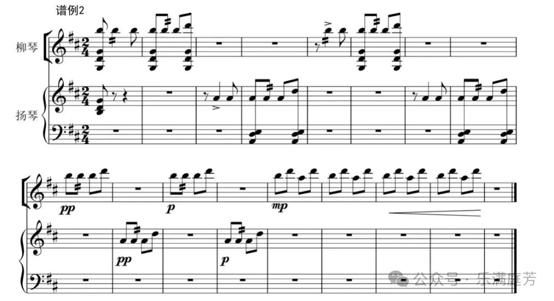 全曲有两个节奏律动贯穿始终,它们在打击乐段落一(A)中即已呈示。乐曲伊始,扬琴的双音重复制造出来的八分音符均衡律动是为律动一,琵琶在四分音符的均分节奏中以切分节奏打破平衡,构成律动二(见谱例1)。这两个节奏律动如同串连全曲的“红绸带”[5],时而隆重登场亮相,时而伴随着旋律段落,退为其背景层次。