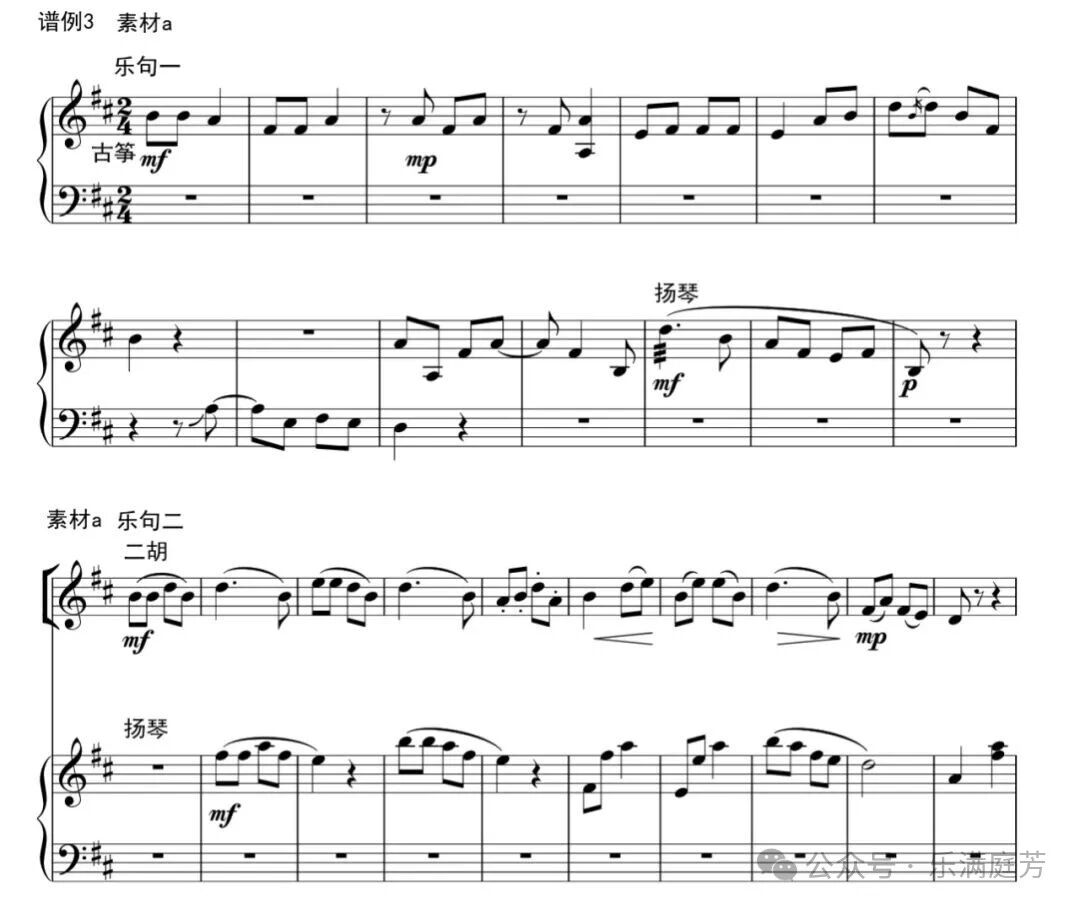 素材a(见谱例3)在第一旋律段出现了两次。首次亮相时在律动二的映衬下,完整地将两个乐句都予以呈示。乐句一在古筝声部摇曳而出,尾音长音延留时由扬琴嵌档填空,将声部顺接了过来,乐句二转至二胡声部,扬琴紧而随之,在二胡声部上方作五度模仿,形成对位式的线条连接。不过,乐句二现身一次之后很快便遁入律动二的切分锣鼓节奏中隐匿而去,此后的素材a事实上是乐句一的诸种变化。此段中,乐句一以“合头换尾”的方式重复出现了一次。作曲家以“加垛”手法扩充了乐句,同时通过节奏重音的改变,在听觉上变原先的2/4拍为3/8拍的律动,为了加强这一律动,在原本的柳琴、筝之上再齐奏叠加了二胡、琵琶声部,与扬琴击奏出的律动一形成节拍错位。乐句中新增的变宫音虽只是短暂经过,却使得调式有了一种瞬间即逝的游移色彩,也为其后音乐中变宫音的出现作了色彩铺垫。