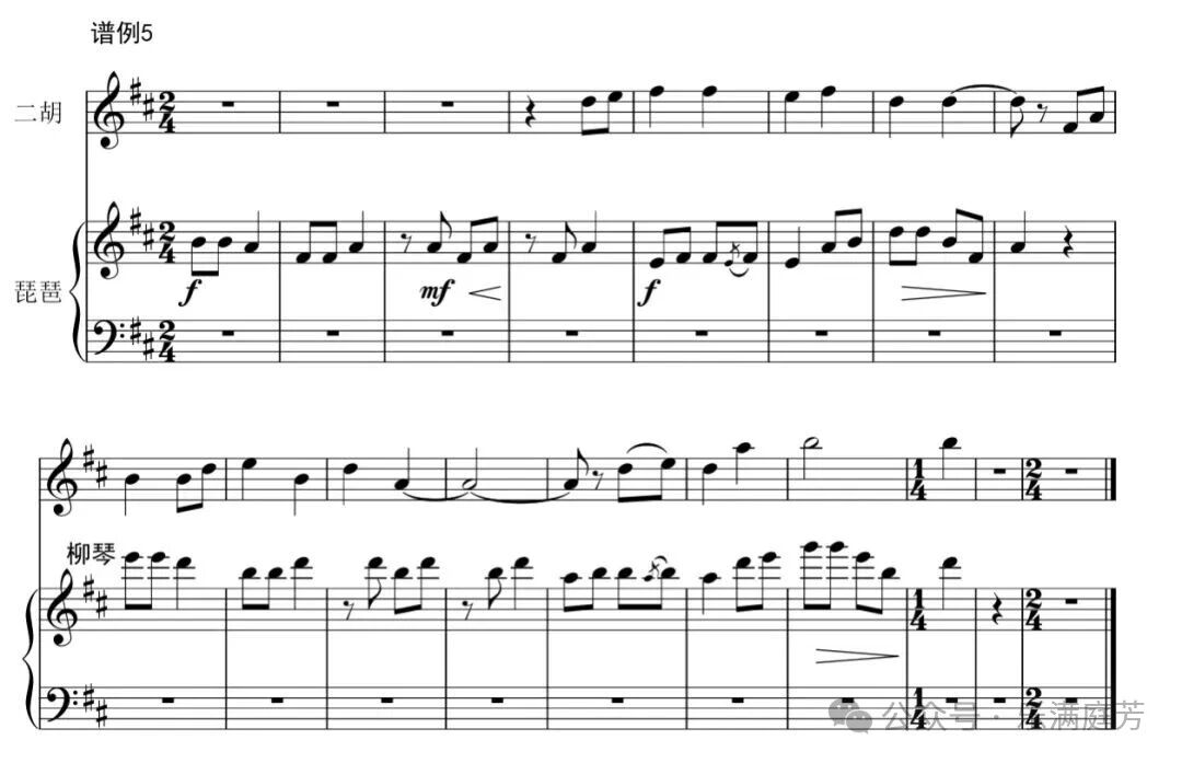 五件旋律乐器被予以“锣鼓节奏化”,它们传统意义上的音响和音色得以改变和突破。曲中有时琵琶“煞音”模拟“小锣”,琵琶“摘音”、扬琴“敲击面板”模仿“板鼓”,柳琴模仿“小钹”,音色清亮;有时古筝演奏出上回滑音模仿“小叫锣”的音色;有时二胡以琴弓撞击琴筒,奏节拍强位,模仿出“拍板”音色……“乐曲的高潮处,琵琶的摘音、古筝的下回滑音、二胡在泛音上的下回滑音模仿小锣声响,声音由轻巧安静至热烈奔放,从一个极端逐渐过渡到另一个极端,音乐在点状中制造变异,色彩由细小颗粒到浑然一片,音响张力逐渐绷紧,速度渐次加快,既具节奏动力又形成高潮线条……”[4]