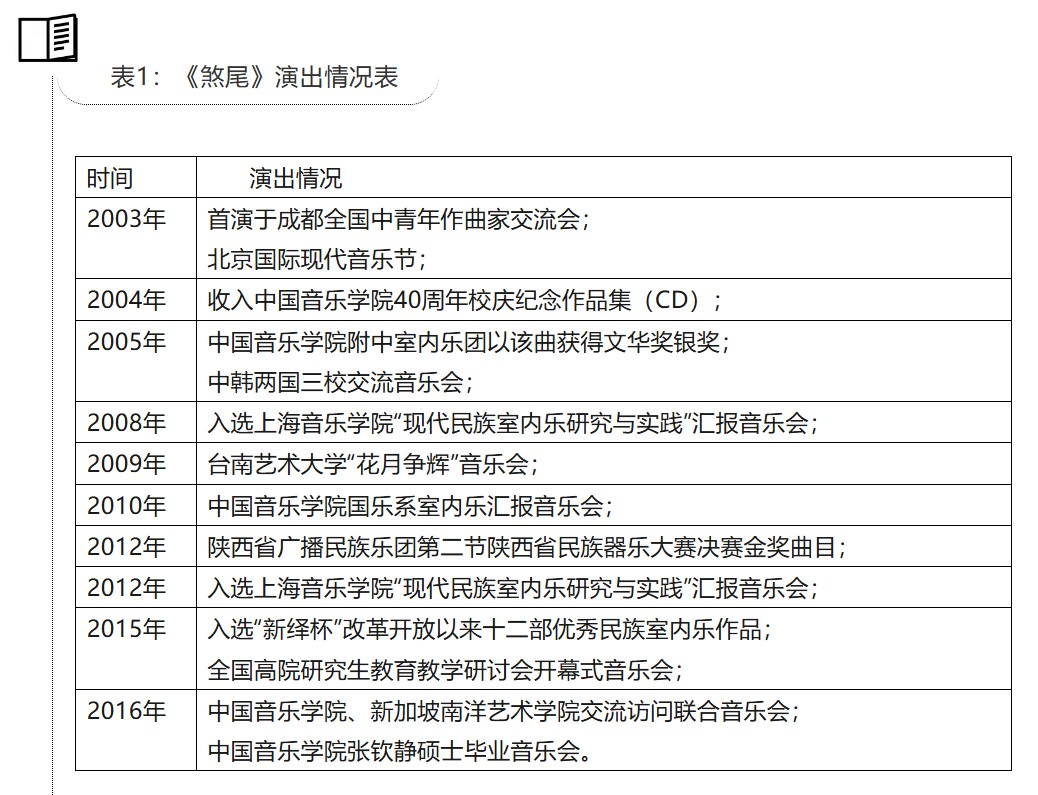 目前,“民族室内乐”这一体裁越来越受到作曲家们的关注,诸多作曲家都对这一体裁进行乐器种类、音响音色、技法观念等方面的探索,也因此产生了许多让人耳目一新的创作理念。在年轻一代的作曲家中,刘青的两部民族室内乐作品《煞尾》和《惜惜盐》也正是这些新创作概念的集中体现。《煞尾》创作于2003年,当时中国音乐学院作曲系受邀参加“2003年成都全国中青年作曲家新作品交流会”,期间准备推出一场民族室内乐新作品音乐会,此时作曲家刘青作为一名青年教师参与其中,推出作品《煞尾》。由中国音乐学院华夏室内乐团首演,反响良好。此后十余年内,这部作品不断上演并收获各种荣誉。经过十几年的打磨,如今《煞尾》已经算是一部相对成熟的民族室内乐作品。(表1)