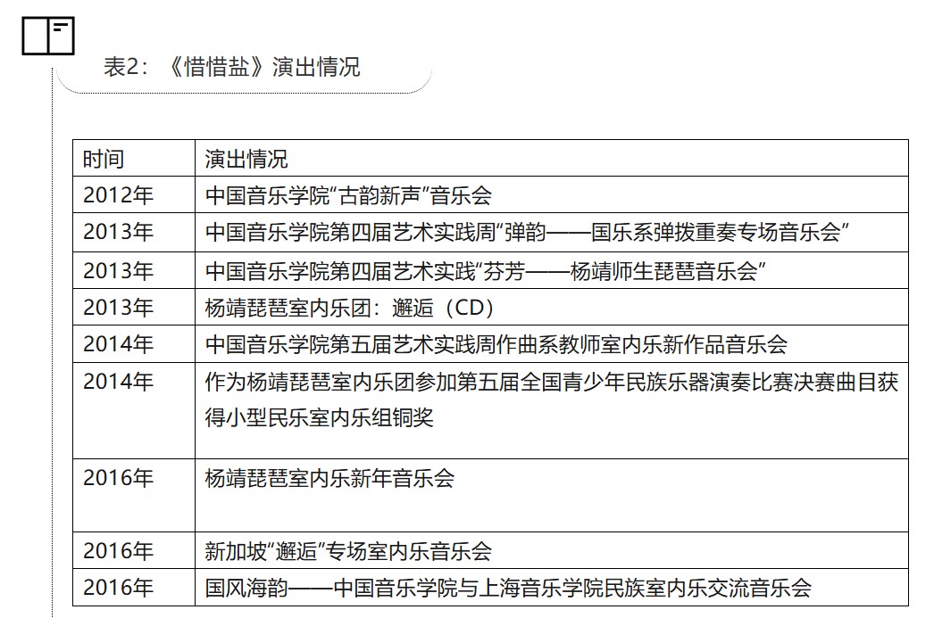 2012年,刘青接受中国音乐学院“古韵新声”音乐会以及琵琶演奏家杨靖教授的委约,创作了一部新的民族室内乐作品《惜惜盐》。作品采用了形制各异的琵琶组合,当时由于系列活动中涉及古代乐器复原的主题,加入了四弦琵琶与五弦琵琶两件复古乐器。作品由杨靖琵琶室内乐团首演,上演之后受到众多演奏家及乐团的一致好评。(表2)