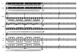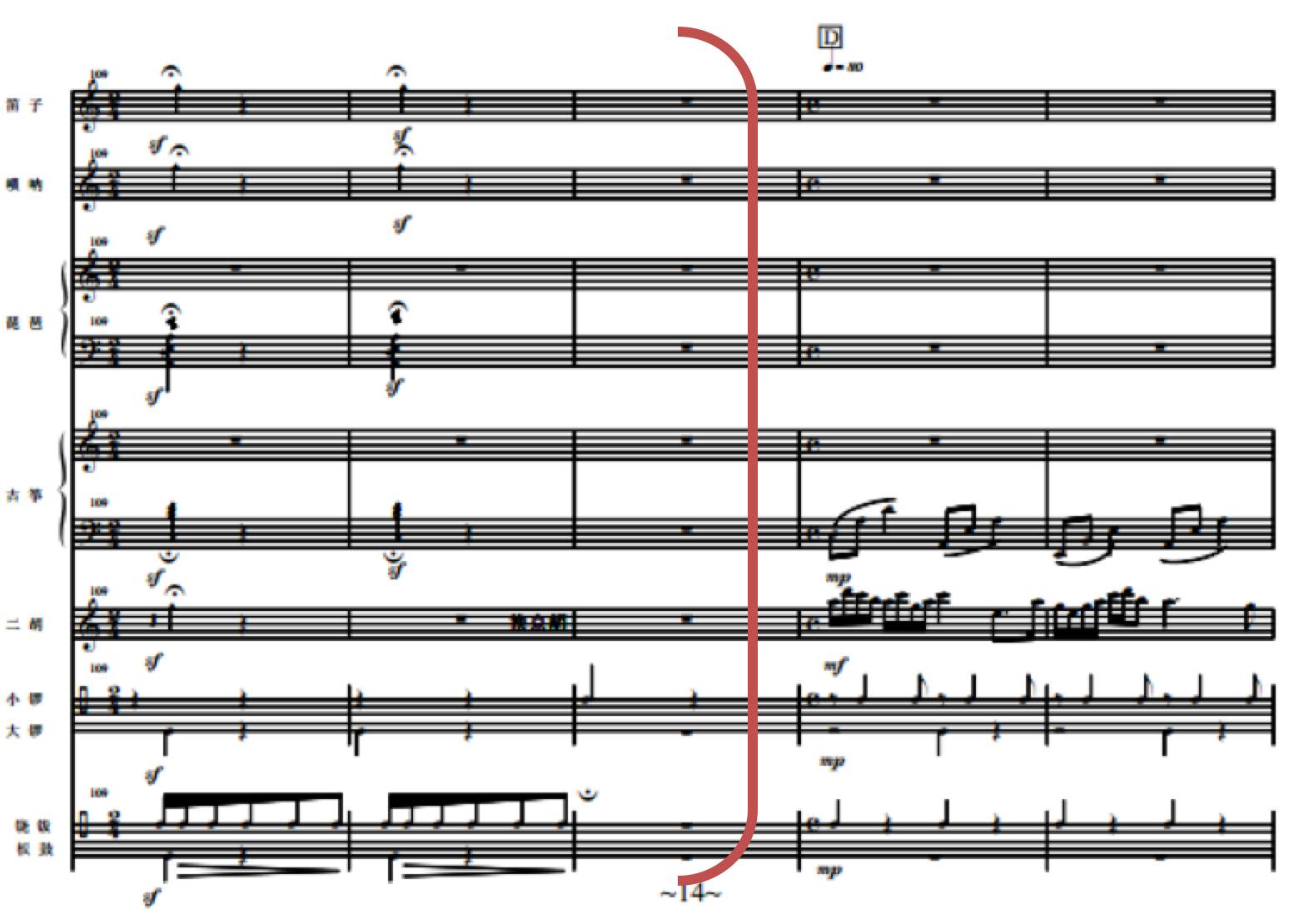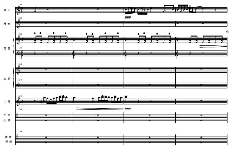 此后第二段转而以变幻莫测的音色尝试为特点。整个段落以管弦乐器为主线,模拟戏曲声腔,其他乐器则模拟戏曲文武场伴奏,形成了自由的唱腔配合多样化的伴奏模式,戏曲音乐风格十分明显。段落开始以笛子、二胡的线性单音与琵琶、古筝点状轮奏交叉引入,进而旋律线以连续的不同声部六连音形式出现,形成快节奏的层次感。伴随琵琶模仿京剧锣鼓经滚头子,插入其他乐器的滑音,形成诙谐、幽默的音效。随后在京剧锣鼓经【急急风】中推向一个演奏高潮,结尾部分用到锣鼓经【回头】。在以一段即兴自由表演完成收束。此段中,于各个乐器之陈述之间已浮现出隐伏的主旋律,被打散的旋律于不同的音色效果交替浮现,在爆炸性的收尾中终止,形成另外一种“煞尾”方式。(谱例2)