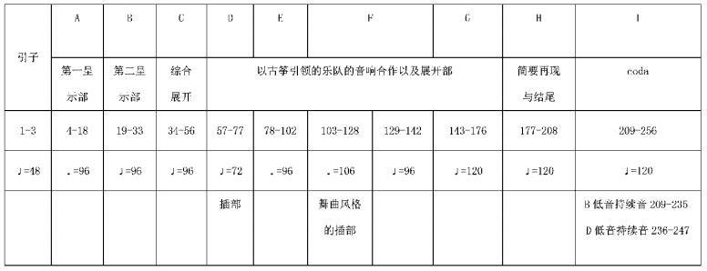 《万古江河》显然受到中国传统音乐结构思维的启发。对于一个成熟的作曲家而言,学习借鉴西方音乐作品的结构看似体系化十足,但实则容易陷入现成的形式化、套路化的西方话语。而与西方对照,中国传统音乐中的一些结构模式(包括戏曲结构)的非常复杂,结构力因素独树一帜。作曲家正是在中国文化的感召之下才设计了《万古江河》独有的结构(见表1)。以下是笔者通过对乐队音响音色布局的观察,对《万古江河》曲式结构进行划分: