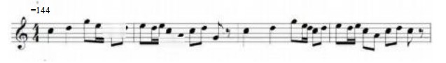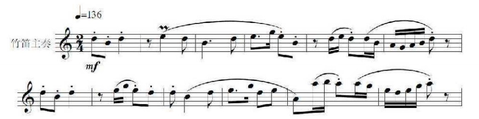 竹笛与乐队《嘎子》以电影《小兵张嘎》的故事为蓝本,以河北民歌《小放牛》为素材,表现小英雄年少率真、临危不惧的人物性格。这首作品在原曲的基础上进行了一次全新的发挥和创造(见谱例2),通过旋律进行中节奏的变换(运用切分音、附点等节奏型)来增强音乐的跃动感,一改原曲繁复连贯的铺陈手法与旋律的下行倾向,使之具有灵动、上扬的特点,烘托出活泼、诙谐的音乐形象。