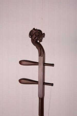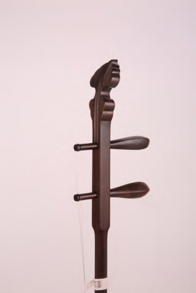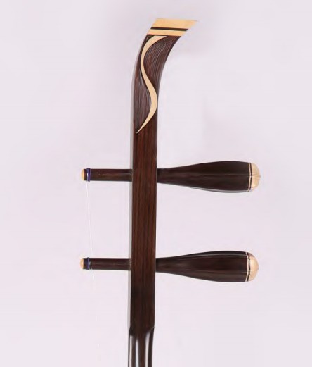 民族乐器是传统文化的重要载体,其美学设计在传承传统文化方面发挥着关键作用。通过保留传统乐器的形态、色彩和材质等特征,美学设计确保了民族乐器的文化认同感和历史延续性。同时,美学设计还可以将传统文化元素与现代设计理念相结合,创造出既具有传统韵味又符合现代审美的民族乐器,从而推动传统文化的创新与发展。例如,现代二胡中龙头琴首造型开始有了“去粗取精”的趋势,这或与减轻演奏者手感负担有关(见图6)。例如,如意式二胡琴首在近代二胡样式中颇具代表性;将其线条进行优化,轮廓线的弧度和角度也更为分明;琴首长度增加后,琴首的饱满度、琴杆的延伸性得到提升;简洁的四方弦轴与如意造型中部的三条饰线形成繁简对比,而弦轴的四个弧面及其形成的弧形棱线,则有一种柔中带刚的韵味(见图7)。例如,直项式二胡,琴杆样式以刘天华20世纪30年代用琴为案例,在此基础上进行改良,可以说海铭蓝二胡在外在气韵上,追随刘天华二胡的格调(见图8)。