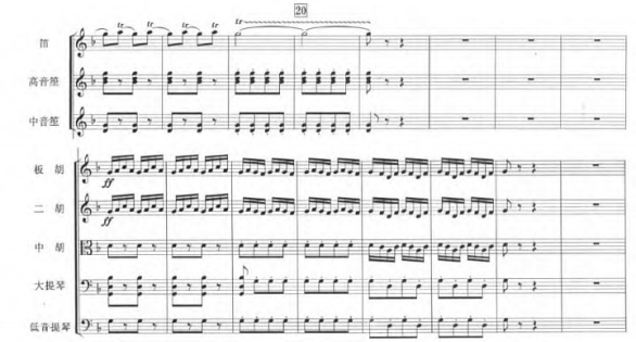 在管弦乐作品中,节奏的运用起着至关重要的作用,它直接关系到整部作品的整体表现力和感染力。《驷马铜铃》这部作品在节奏的处理上运用简洁明了的创作手法,使得整首曲子听起来清晰、流畅。具体分析为以下几个方面。