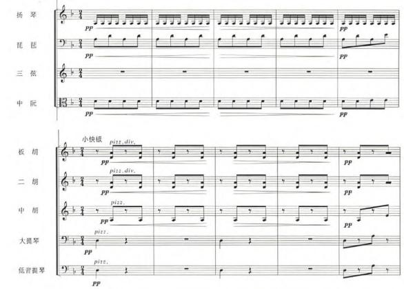这部作品的创作融合了西方作曲技法和中国传统音乐元素,通过独特的旋律线条和丰富的和声织体,展现出了浓厚的东北地域风情。在旋律的构思上,作曲家巧妙地运用了东北民间音乐的元素,如颤音等装饰音的运用,使得旋律更加生动,富有表现力。乐曲伊始,便由扬琴、琵琶、中阮、板胡、二胡、中胡等乐器演奏营造氛围,描绘出骏马从雪地奔腾而来的场景画面。(见谱例4)在上述乐器“pp”力度的伴奏下,独奏的竹笛以其特有的悠扬和清脆,演绎出欢快、热情的主题旋律,仿佛在讲述猎人在面对丰硕的成果时的喜悦心情。(见谱例1)