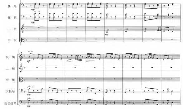 第二,织体写作特色显著。在这两部民族管弦乐队的编制创作过程中,作曲家特别突出独奏声部,清晰地界定了旋律与伴奏之间的主次关系。在展现独奏者精湛技艺的过程中,伴奏乐队巧妙地运用了分解和弦与节奏交替的织体手法,为演出增添了丰富的音乐层次。此外,连接部分的处理尤为精妙,乐队在承担过渡角色时,不仅巧妙地连接了各个音乐段落,还通过复调织体的运用,使得音乐在转换中保持了高度的连贯性和内在逻辑。这种处理方式不仅增强了音乐的整体感,也让听众在欣赏过程中感受到了作品深层次的构思与安排,进一步提升了作品的艺术表现力。