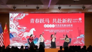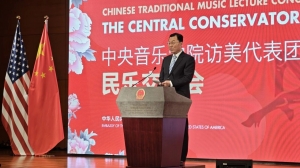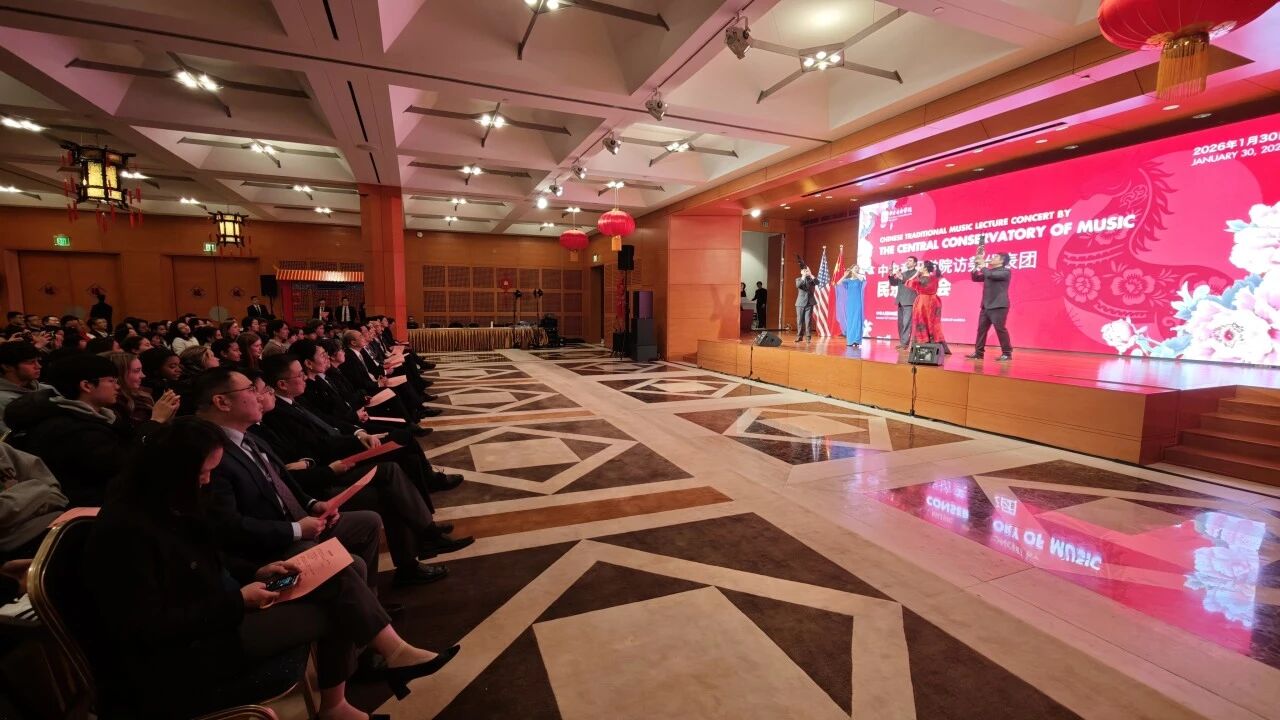 1月30日下午,代表团自费城抵达华盛顿特区,在中国驻美国大使馆献上一场意蕴悠长的交流音乐会。音乐会荟萃京剧锣鼓《大闹天宫》、竹笛与笙《喜相逢》、琵琶齐奏《天山之春》、琵琶与阮《彝族舞曲》、唢呐独奏《百鸟朝凤》、二胡齐奏《良宵》《赛马》、民乐合奏《花好月圆》等经典民乐佳作。在美当地华人华侨及200余名美国中学生齐聚现场,在热烈的氛围中,共赏中国音乐的独特魅力。中国驻美大使谢锋出席交流会并在开场前发表热情洋溢的致辞,对中央音乐学院此次赴美访演予以充分肯定与高度评价。