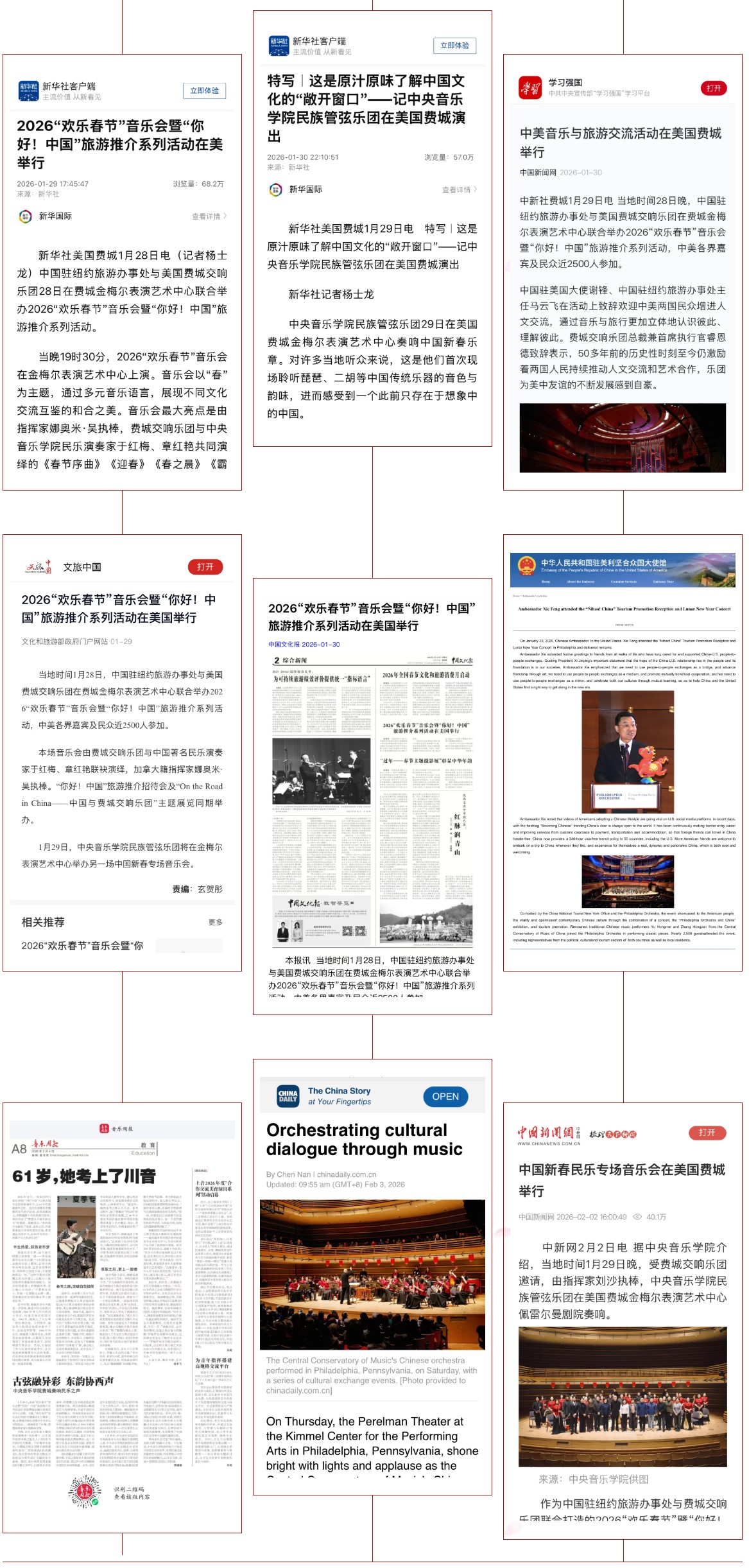 从费城到华盛顿,此次赴美系列演出与学术交流,让中国音乐在国际舞台绽放光彩,彰显了中华优秀传统文化的深厚底蕴与时代活力,也推动了中外音乐的交流互鉴。本次系列活动引发海内外主流媒体广泛关注,新华社、人民网、中国新闻网、中国网、《光明日报》《中国文化报》《中国艺术报》、CHINA DAILY 等纷纷予以了报道。