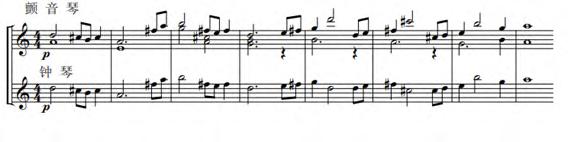 这段在较慢的速度中由颤音琴和钟琴演奏的音乐纯净空灵、余音袅袅,颇有天籁的感觉。音乐调式调性明确,可分为前后两个4小节的结构单元,在节奏形态(先顺分后逆分)和旋律进行方向(先下行后上行)上相反相成。旋律主要运用模进手法发展,在保持材料高度一致性的同时又蕴含着较强的动力化因素。这段“引子”在之后的几个乐章中多次出现,尤其在末乐章中还作为重要的主题材料进行了充分展开。从主题的音乐特质、作品立意的发展脉络来看,该主题在全曲中具有较强的基础性意义,因此可称之为“光明主题”。