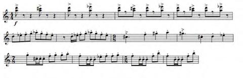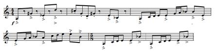 该主题的前2小节具有鲜明的无调性特征:第1小节为两个上行的大七度,两个大七度之间则是三全音关系;第2小节则是三个三全音音程的连接。后四小节为以两小节为单位的重复结构,虽然出现了连续的级进进行,但调性依然模糊,每个小节都以三全音音程结束,保持了与前2小节的联系。虽然从谱面上看前四小节都为4/4拍,但第3-4小节通过重音的调整而改变了4/4拍的节拍规律,8个八分音符按照3+3+2(1+1)的方式加以组合,实际上已经具有了以八分音符为单位拍的特征,到第5-6小节则直接变成5/8拍。现代音乐中打破传统节拍节奏周期循环规律甚至频繁变换节拍的手法并不鲜见,但能够在转换时还有意保持渐进式的联系,确实别出心裁。