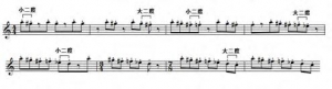 在一段纯音型化和弦材料的连接过渡之后,第二主题由柳琴、琵琶、中阮和中胡声部奏出(见谱例4)。