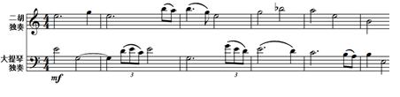 该部分没有长线条的旋律,而是以两音、三音和四音片段自由组合而成,所有片段的音调均采用下行进行,由高胡和二胡以颤弓演奏,音响纤弱,两个声部间形成模仿式的呼应,生动地表现了类似哭泣、抽噎的效果。在追逐光明未来的道路上难免会有牺牲,而这段音乐主要表现的应该就是对牺牲者的哀思与缅怀。