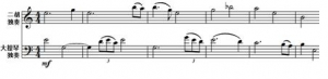 第二乐章表现的是病魔肆虐、灾难来临的情景以及人类的痛苦挣扎与奋勇抗争。为了表现特定的形象内容,该乐章的音响以不协和为主要特征,体现出较强的戏剧性张力。该乐章由两个主题及其变化重复构成,由于尾声中再次出现第一主题的材料,因此整体上又体现出三部—五部曲式的特征。该乐章仍然以“光明主题”作为引子开始,在拉弦乐器声部静态的和声背景中由琵琶独奏,营造了短暂的宁静。之后,音乐情绪迅速转换,速度加快两倍,乐队全奏以小二度和三全音音程为主构成的和弦,音响十分尖锐,就在这一音型背景中引出了该乐章的第一主题(见谱例3)。