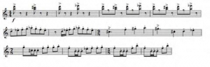 第一乐章采用再现四部曲式结构,首尾是主要主题的呈现,中间以两种不同性质的材料与之形成对比。主要主题首先在第44小节处由笛声部奏出(见谱例2)。