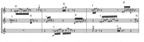 该插部也是由一些长短不一的碎片化音组构成,各音组音符数量的安排按照斐波拉契数列的前五个数(即1、2、3、5、8)循环往复,每个音组之间都以长短不等的休止隔开。各声部都按照这样的数列独立运动,但声部间形成了看似偶然实则严密控制的节奏对位。从音高材料来看,这些音组的核心材料基本上都是小二度与三全音。在这些音组横向进行的同时,其他声部还有一些纵向音块化的和声铺垫,使音响具有较高的紧张度。这样的材料及音响与第二乐章的第一主题有着十分密切的内在联系,似乎是在提醒人们不要忘记痛苦、时刻警惕恶魔卷土重来。