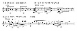 为了追求古色古香之意蕴,作曲家重点引用了琴曲《梅花三弄》的泛音主题,作为贯穿整部交响套曲的核心音调。关于《梅花三弄》,《蕉庵琴谱》如是题解:“从容和顺,为天地之正音;而仙风和畅,万卉敷荣,隐隐现于指下。但新声奇变,稍近时俗,然恬静幽清亦古曲也。”其中的泛音表现是“以梅为花之最清,琴为声之最清,以最清之声写最清之物,宜其有凌霜音韵也。”(杨抡《伯牙心法》)可见琴曲《梅花三弄》寓意着古代文人对高洁情操的精神追求,反映出“儒道”合一的文化意蕴。作曲家正是借助这一耳熟能详的音乐,使这一核心主题犹如星星之火那般,通过衍化发展,燎原于整部交响乐中。