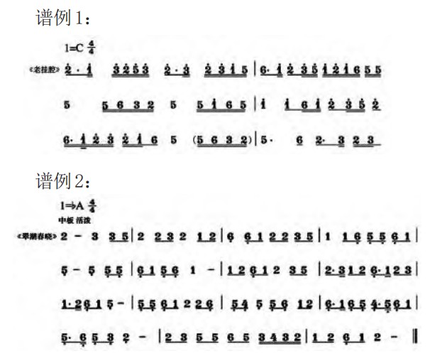 如上图分别为谱例1(百代国乐队录制唱片附页中《翠湖春晓》第一段)及谱例2(《老挂腔》原谱),谱例皆为重新制谱。
